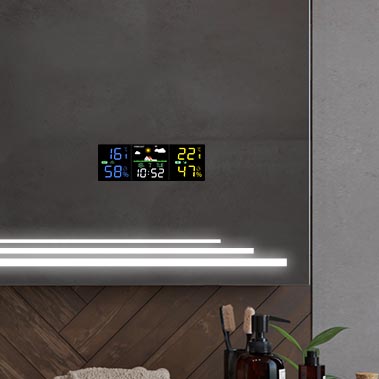 Our mirrors are not just about lighting, choose from one of the information displays available. From the simplest watch to weather trend forecast stations. Ideal solutions that practically streamline your daily routine.